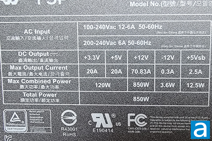 The voltage specification label for the FSP Dagger Pro 850W is located on the top of the power supply unit. Two virtual rails are visible here. Up to 20A can be delivered on both the +3.3V and +5V rails, making for a power rating of 66W and 100W, respectively. The combined output for the +3.3V and +5V rail is 120W. This means the total power allocation combination must fall within the limits of the listed specifications. The +12V rail is rated to deliver up to 70.83A, making for a power output of 849.96W. This is done to maximize power delivery flexibility compared to multiple +12V rails. The combined power output for the FSP Dagger Pro 850W is 850W, as the name implies. As a reminder, the power distribution on your system must not exceed the rated limits -- that being 66W on the +3.3V rail, 100W on the +5V rail and 120W combined for both, 850W on the +12V rail, and 850W combined between all the positive rails. The power distribution of the FSP Dagger Pro 850W is reasonable for an 850W power supply unit, although I have seen higher +3.3V and 5V rails for lower output rated units.