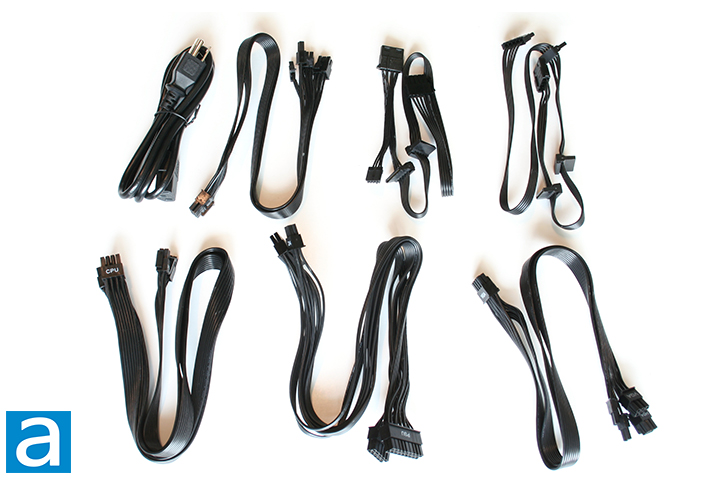 Out of the box, we get ten modular power cables and one AC power cable with the FSP Dagger Pro 850W. As expected, the modular cables are quite easy to bend. The flat cables are flexible enough to allow easy cable management in a desktop computer. 18 AWG wires are found on all the cables, which is common in modern supplies. The company opted out of fattening the high current motherboard and PCIe cables to 16 AWG.