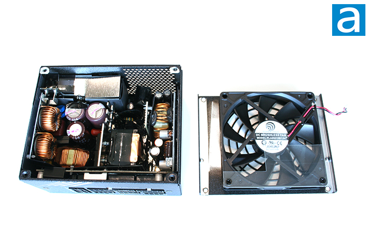 In terms of cooling performance, there are two things we need to pay attention to for a power supply unit; namely the heatsinks and cooling fan. In this case, we can see multiple heatsinks and one cooling fan inside FSP’s Dagger Pro 850W. The layout of heatsinks inside the SFX power supply unit is well-thought-out to fit into such a tiny enclosure. The OEM of the fan is Power Logic, with PLA09215B12H as the model number. This is the same fan used in the 650W version. The size of the fan is 92mm in diameter, which is the maximum the enclosure can accommodate. Further research indicates the PLA09215B12H is a ball-bearing fan that runs at a current of 0.55A. Ball-bearing fans are generally more reliable than sleeve bearing fans, although this comes at the cost of more noise. However, the FSP Dagger Pro 850W is a semi-fanless PSU, meaning the fan will only operate when there is enough load.