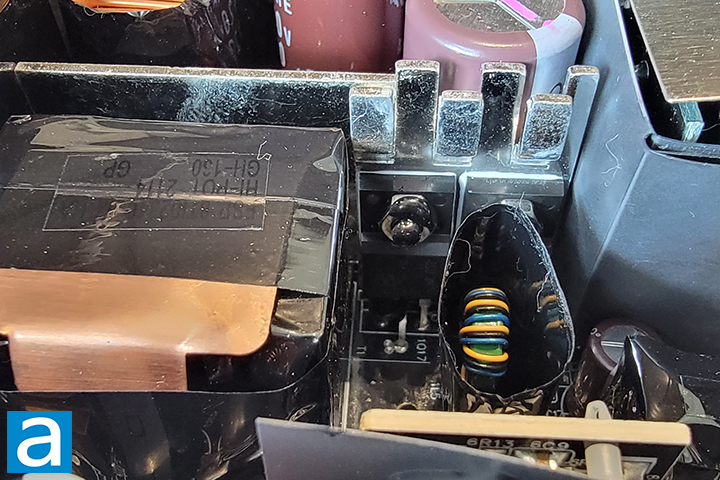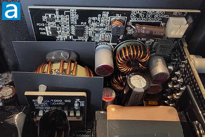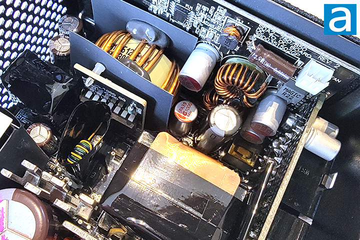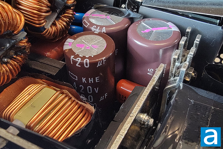 The active power factor correction or APFC circuit uses two HY GBU1506U rectifier bridge attached to the first heatsink. At 115V, it has a rated current of 15A at 100 degrees Celsius, so you can theoretically pull 3450W (15A * 115V * two diodes). This, of course, is limited to the fact that it is not 100% efficient, just like any electrical component or device. This also neglects the fact that other components are unable to keep up. Either way, this far exceeds the 850W this power supply unit is rated for.