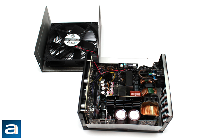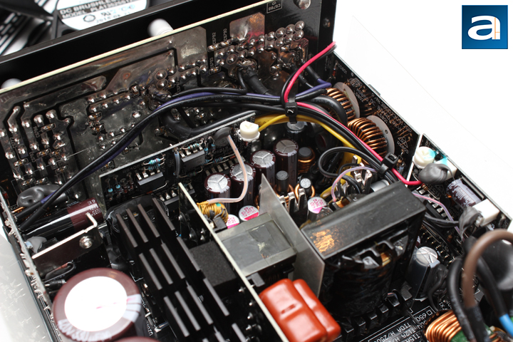 As we usually do, we opened up the FSP Hydro G 850W power supply to take a closer look at what is going on inside. Opening up this power supply will void your five year warranty, as the warranty seal covers one of the chassis screws. For your benefit, we voided our warranty on this unit, so you do not need to. There are zero user serviceable parts inside anyway. Removing the top shell from the FSP Hydro G 850W is quite easy, as it just requires four screws to be removed, one at each corner. Afterwards, you can easily slide out the panels and get inside quickly. As with all FSP units, the Hydro G 850W's OEM is FSP, and they are one of the few who actually sell their own power supplies under their own brand. The photo above shows an overhead view of its internal components. Build quality looks pretty good, as expected from the company. There does not seem to be any large globs of glue anywhere, but we will look closer into this later. Otherwise, there is a total of two large heatsinks, all of which are unpainted.