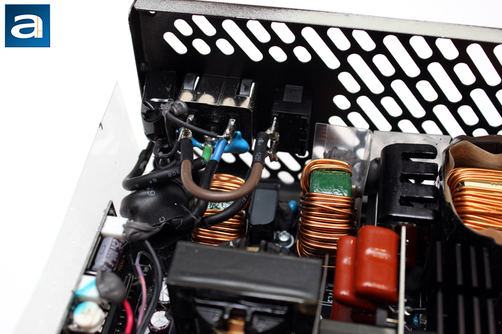 The transient filter stage is the first input stage of any computer power supply, so we will take a closer look at this first. From here, you can see there are two ferrite coils and one metal oxide varistor. A single X-capacitor and two Y-capacitors are placed at the AC receptacle, while another additional set of one X- and two Y-capacitors are found on the main board. In total, this is twice the amount of X and Y capacitors recommended, which is great to see. In addition, the MOV being present here is good, as they are intended to protect your power supply from AC line voltage spikes. An NTC thermistor and relay is present here to provide inrush-current protection here.