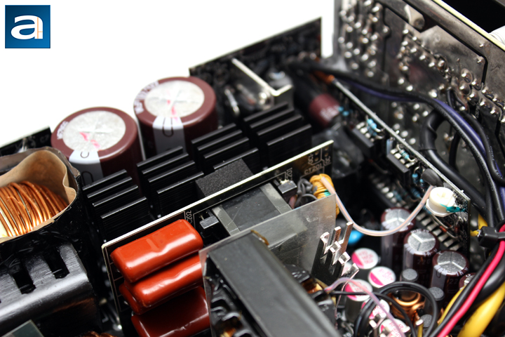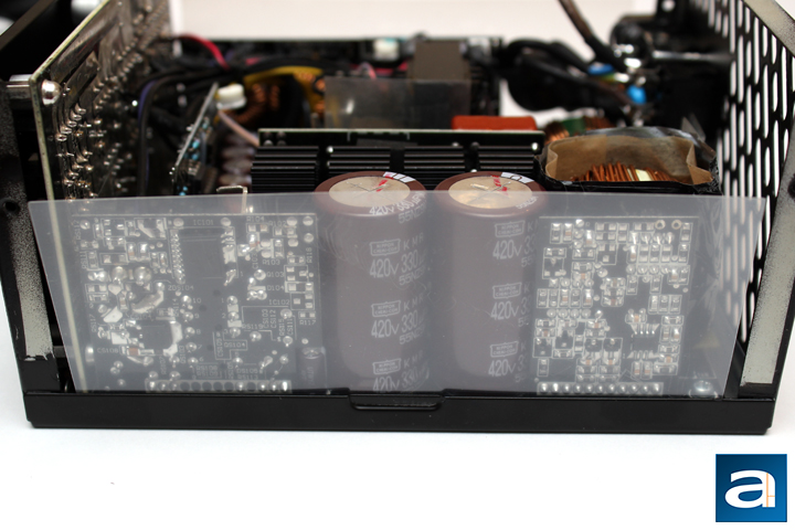 On the primary side, we have two Japanese brand Nippon Chemi-Con capacitors. As FSP listed only Japanese electrolytic capacitors are in the Hydro G 850W, it is great to see them delivering in their promise, but it is obviously not surprising. Both of these capacitors are rated at 330µF at 420V for a total of 660µF equivalent capacitance. They have temperature ratings of 105c. To give some perspective, more budget friendly power supplies stick to only 85c rated capacitors.