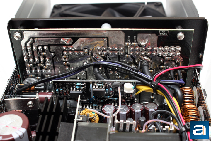 Finally, to the back, we have a large daughterboard covering the entire rear panel. This is where the modular cable sockets reside. Layout of the output connectors can be found on the previous page. There is nothing too special going on here, electrically speaking. I will say there is quite a bit of solder in some areas, and it does not look as clean of a layout as I have seen from other power supply manufacturers, but this is not a huge deal. Overall, the internal build quality of the FSP Hydro G 850W is pretty good. Component selection here is all quite top of the line, with a decent layout for cooling. There are some wires running through the middle, but otherwise, there is not too much for concern. One thing interesting here is the fact this board is connected to the chassis in a unique way, with four copper bars attaching this daughterboard to the outer shell. According to FSP, this allows for better durability and rigidity, ensuring the connectors stay in place.