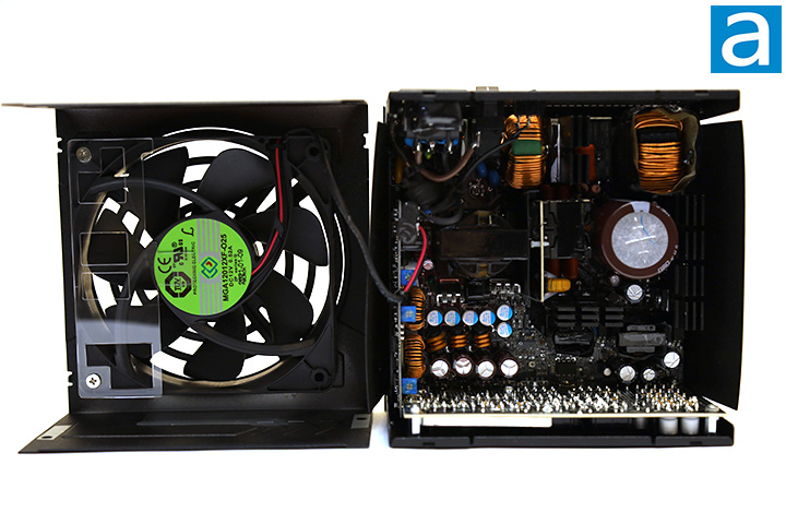 Lastly, we see a 120mm fan that provides cooling to the FSP Hydro G Pro 1000W's internal components. It is connected to an add-in board using a 2-pin connector. A 120mm fan is rather small nowadays for a power supply with a bottom mounted fan, but if not a lot of heat is being generated, it should not be much of an issue. A 120mm fan is used to keep the enclosure as small as possible. Protechnic Electric is the fan OEM with MGA12012XF-O25 as the model number, as shown in our photo above. Further research indicates the MGA12012XF-O25 is a fluid dynamic bearing fan specified at 96.20 CFM, 5.51mmH2O, 40.6 dB(A), and 0.52A for a maximum speed of 2700 RPM.