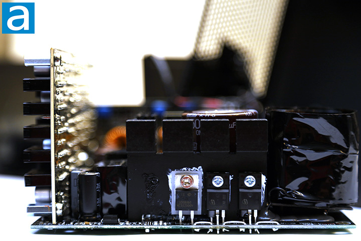 The active PFC circuit featured on the FSP Hydro G Pro 1000W uses two Diodes Incorporated GBJ2506 bridge rectifiers on both sides of the first heatsink. At 115V, the maximum rectified forward current capacity with heatsink is 25A each, so you can theoretically pull up to 5750W (25A * 2 diodes * 115V) from the bridge rectifier at 100% efficiency. Of course, this is limited by the fact that it is not 100% efficient and also neglects the fact that not every component in the system is able to keep up. Further down the line, on the outside of the largest heatsink, we can see two Infineon IPW60R120P7 power transistors. Each is certified for up to 16A at 100c. These transistors present a maximum resistance of 120 mΩ when turned on according to the manufacturer's data sheet. This on characteristic is called Static Drain-Source On-Resistance, or commonly abbreviated as RDS(on). The more efficient the component is, the lower the RDS(on) value, since it wastes less power with lower resistance. A Cree C3D08060A Schottky diode is placed right next it. A Chino-Excel Technology CEF04N7G N-channel enhancement mode field effect transistor is found on the opposite side of the same heatsink in the Hydro G Pro 1000W power supply as well.