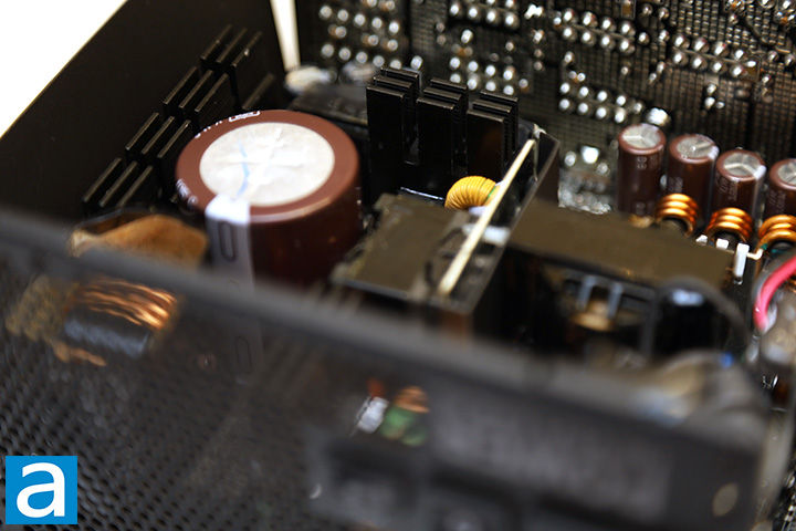 On the primary side, we can see one Japanese brand Nippon Chemi-Con capacitor. 100% Japanese brand capacitors are specified on the marketing material, so this is to be expected. Our 1000W version of FSP's latest Hydro series power supply incorporates one 680µF x 450V capacitor. It is rated at 105c; whereas more value-oriented power supplies usually use 85c rated capacitors.