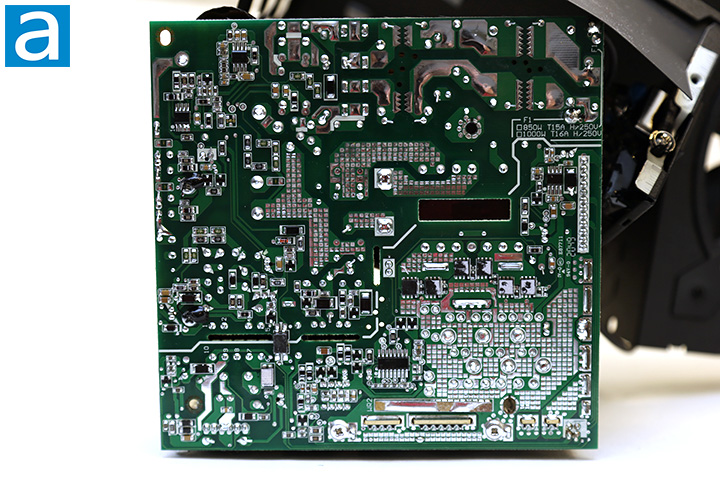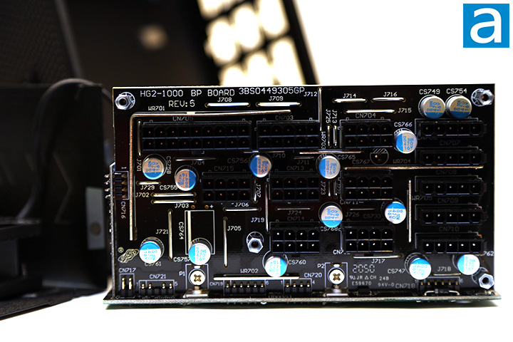 At the back, we have a large daughterboard covering the entire rear panel for the modular cable sockets. All modular sockets at the bottom are soldered directly to the main PCB after the secondary stage. Pin headers join the mainboard and daughterboard to reduce power transmission loss. The output connector configuration can be seen on the previous page. Overall, the internal build quality of FSP's Hydro G Pro 1000W power supply is good -- something we would expect from an FSP-built unit. Components are arranged very well for optimal cooling with almost no wires running around inside, and solder points on its black/green PCB is quite clean in general. I would say the FSP Hydro G Pro 1000W is generally excellent with regards to the selection of components used under the hood.