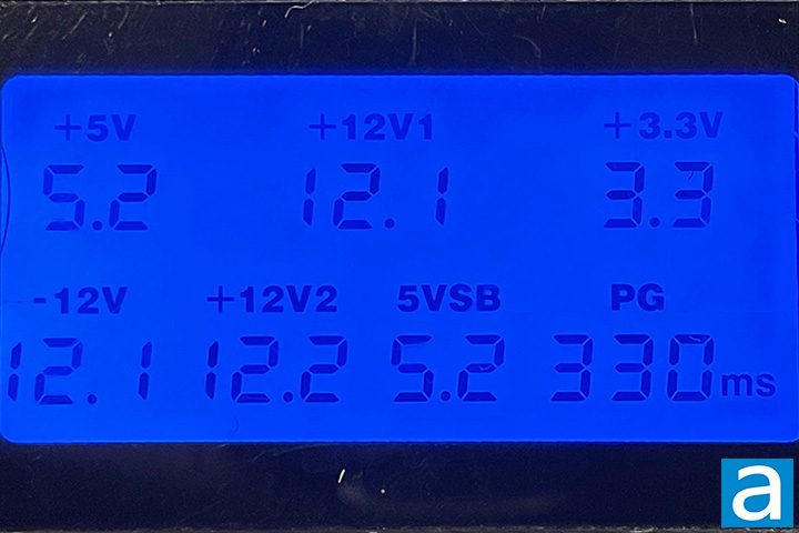 Voltages with minimal load are generally accurate, which is a basic requirement of power supplies out of the box. In this situation all are within 4%. The Power Good or PG delay is well within the general power supply standard of 330ms, but follows an older ATX specification. The ATX design specifications state a PSU's PG is required to be between 100ms and 500ms, with 250ms maximum for Non-Alternative Sleep Mode and 150ms for Alternative Sleep Mode.