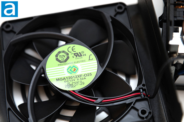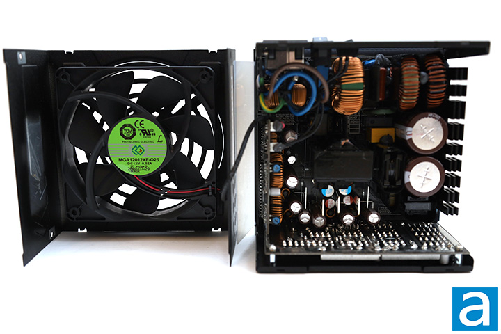 The fan model is Protechnic Electric MGA12012XF-O25, as shown in our photo above. The MGA12012XF-O25 is a fluid dynamic bearing fan specified at 0.52A for a maximum speed of 2700 RPM, 96.20 CFM air flow, 5.51 mmH2O air pressure, and 40.6 dB of noise. The fan is not supposed to activate until the PSU is loaded to approximately 360W with semi-fanless mode active. As such, it should remain off for the most part, and even when it is on, the fan speed will vary with load. Fans with fluid dynamic bearings generally have much longer lifespans compared to sleeve bearing fans and are quite suitable for this application.