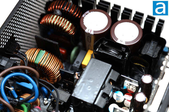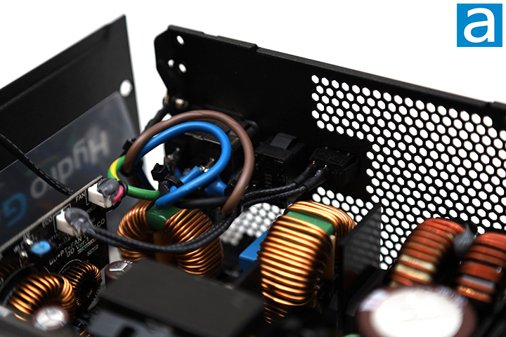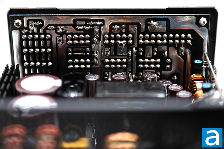 On the primary side, we can see two Japanese brand Nippon Chemi-Con capacitors. Japanese brand electrolytic capacitors are specified on the marketing material, so this is to be expected. Our 1200W version of FSP's Hydro G Pro series power supply incorporates two capacitors, both 560µF x 450V, in parallel for a total of 1120µF capacitance. They are rated at 105c, whereas more value-oriented power supplies usually use 85c rated capacitors.