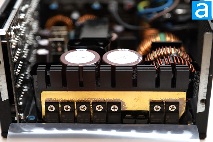 The active PFC circuit featured on the FSP Hydro G Pro 1200W uses two bridge rectifiers on both sides of the heatsink closest to the transient filter stage. Unfortunately, I was unable to identify their brand and part number, as there were no discernible markings on the chips.