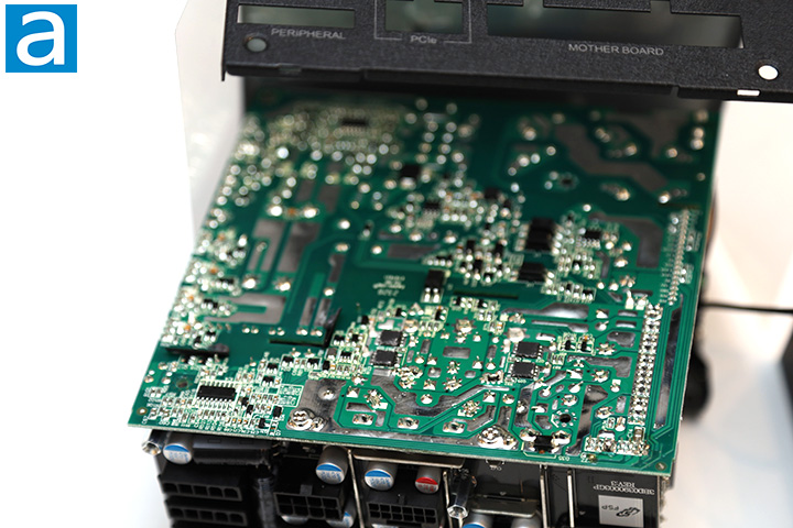 At the back, we have a large daughterboard covering the majority of the rear panel for the modular cable sockets. All modular sockets at the bottom are soldered directly to the main PCB after the secondary stage. Pin headers join the mainboard and daughterboard to reduce power transmission loss. The output connector configuration can be seen on the previous page.