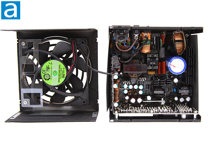 Lastly, we see a 120mm fan that provides cooling to the FSP Hydro G Pro 750W's internal components. It is connected to an add-in board using a 2-pin connector. A 120mm fan is rather small nowadays for a power supply with a bottom mounted fan, but if not a lot of heat is being generated, it should not be much of an issue. A 120mm fan is used to keep the enclosure as small as possible. Protechnic Electric is the fan OEM with MGA12012XF-O25 as the model number, as shown in our photo above. Further research indicates the MGA12012XF-O25 is a fluid dynamic bearing fan specified at 96.20 CFM, 5.51mmH2O, 40.6 dB(A), and 0.52A for a maximum of speed of 2700 RPM.