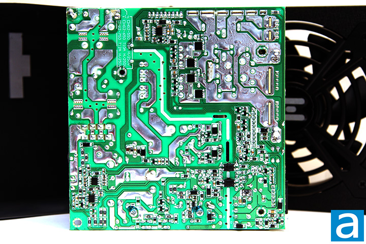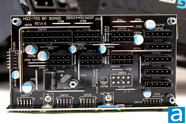 At the back, we have a large daughterboard covering the entire rear panel for the modular cable sockets. All modular sockets at the bottom are soldered directly to the main PCB after the secondary stage. Pin headers join the mainboard and daughterboard to reduce power transmission loss. The output connector configuration can be seen on the previous page. Overall, the internal build quality of FSP's Hydro G Pro 750W power supply is good -- something we would expect from an FSP-built unit. Components are arranged very well for optimal cooling with almost no wires running around inside, and solder points on its black/green PCB is quite clean in general. I would say the FSP Hydro G Pro 750W is generally excellent with regards to the selection of components used under the hood.