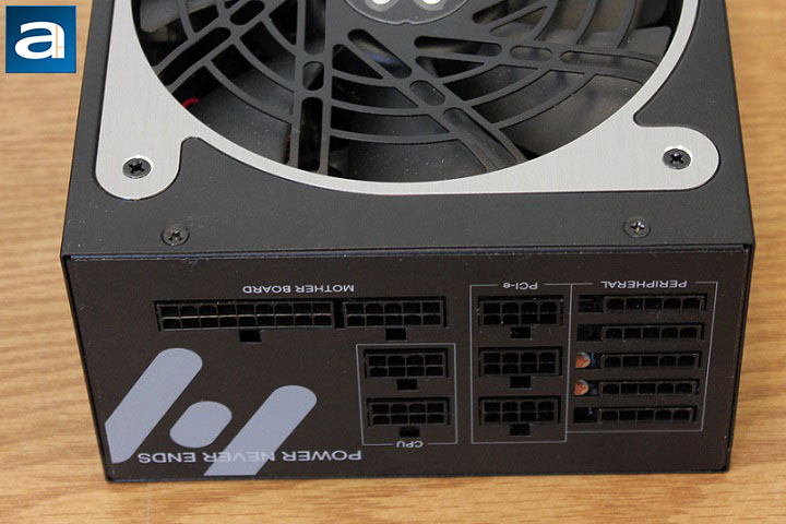 The back of the power supply unit is the connection panel. The sockets are easy to use thanks to the labels on the panel; nonetheless it is not the standard two-row pattern. Sorry for the upside down photo. On the right hand side of the panel in the above photo, there are five peripheral power outputs. All the five sockets are grouped together. Besides the peripheral section, there are three sockets for PCI Express connectors grouped together. Two 8-pin CPU output sockets are presented for the ATX 4+4 connections. Last but not the least, the motherboard pins are located underneath the CPU output sockets. Thanks to the good design of the sockets, it is not possible to plug cables into the wrong connectors. For example, the user cannot plug the ATX 4+4 pin to the PCI Express output, even though they look similar in terms of pin layout.