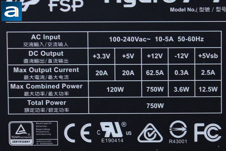 The above photo shows three sides of the FSP Hydro PTM 750W; namely the bottom, back, and left sides. On the bottom, there is a grille above the cooling fan. The details of the cooling fan will be investigated later. The top side of the power supply unit is not shown in the photo, but that does not mean there is nothing worth showing. In fact, a sticker can be found on the top side to show the power output specifications.