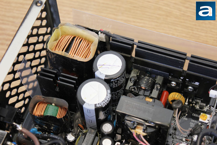 Now, we move on to the primary side. The two big capacitors in the photo are Rubycon capacitors, which are rated at 330uF at 420V each. The temperature is rated at 105c, which is the standard in terms of durability. They are Japanese brand capacitors, therefore it may have a higher cost, but the quality would be better compared with the capacitors made in other countries. For the standby 5V PWM control, there is a Power Integrations SC1226K chip. On the right hand side of the two capacitors, there are also three Toshiba TK20A60W ICs attached to the heatsink panel. As for power efficiency’s perspective, the Toshiba TK20A60W features 0.13 ohms drain-source on-resistance. Note the lower the drain-source on-resistance, the more efficient the transistor will be.
