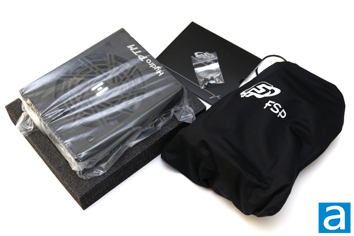 Out of the box, the FSP Hydro PTM Pro 1200W is packaged in a clear plastic bag and seated between two thick foam brackets. This should prevent any impact from damaging the power supply. A nice fabric FSP-branded bag is found in the box. This holds all of the included cables. A small resealable bag contains some mounting screws for this power supply. Finally, some documentation, warranty information, and side stickers can be found in a paper envelope. As we have seen on other Hydro branded power supplies, FSP gives users the ability to customize their power supply appearance, even if they are often just hidden away in the basement of your computer case.