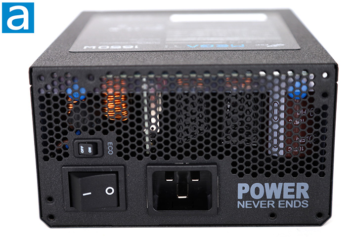 Starting from the back part of the power supply, we have the same familiar honeycomb mesh design as most PSUs with a bottom mounted fan. What you will find here is a horizontally aligned C20 male connector for power input near the bottom edge along with a large on/off switch next to it on the left. The C20 plug is used to ensure a high current certified power cable is used. The included AC power cable is a fat 14 AWG unit, but unless you have a stack of these kicking around, be sure not to lose it. Some space to the right of the C20 connector is reserved for the slogan, "Power Never Ends", even though there is nothing using the space behind it on the other side. A tiny rocker switch to toggle the semi-fanless Eco Mode is above the large on/off switch. I find having the semi-fanless toggle switch here to be convenient, since some older power supplies have it on the inside rather than the outside. However, I do not see a reason why you will not leave Eco Mode on. Eco Mode keeps the fan off until it exceeds about 40% of the load threshold. Disabling Eco Mode ensures the fan stays on at all times, but the FSP MEGA TI is intelligently designed to keep it from overheating regardless of what the active setting is.