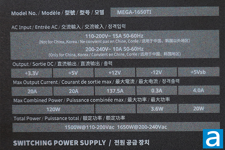 The voltage specification label is located on the top of the FSP MEGA TI 1650W. There are two main virtual rails. Up to 20A can be delivered via the +3.3V rail for a total of 66W, while the 20A on the +5V rail brings the output to 100W in this area. The total combined output for the +3.3V and +5V rail is 120W. In other words, your power allocation combination must fall within the limits of the listed specifications. Meanwhile, a single powerful +12V rail delivers up to 137.5A -- 1650W -- to maximize power delivery flexibility compared to multiple rails. Overall, the combined power output for the whole FSP MEGA TI 1650W is 1650W, as its name suggests. It does sound a bit confusing to understand how this works at first, but generally speaking, this configuration allows sufficiently flexible power demands and should be sufficient to accommodate most users. The power outputs in the +3.3V and 5V rails are within the norm, as most PSUs in this wattage range released in the last few years usually have them between 20A and 22A. This is because modern systems do not have a lot of need in this area.
