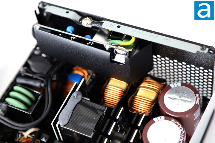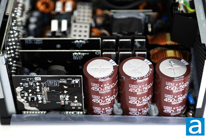 On the primary side, we can see three Japanese brand Nippon Chemi-Con capacitors. Japanese brand bulk capacitors are specified on the marketing material, so this is to be expected. Our 1650W version of FSP's MEGA TI series power supply incorporates three capacitors, all 560µF x 450V, in parallel for a total of 1680µF capacitance. They are rated at 105c, whereas more value-oriented power supplies usually use 85c rated capacitors.