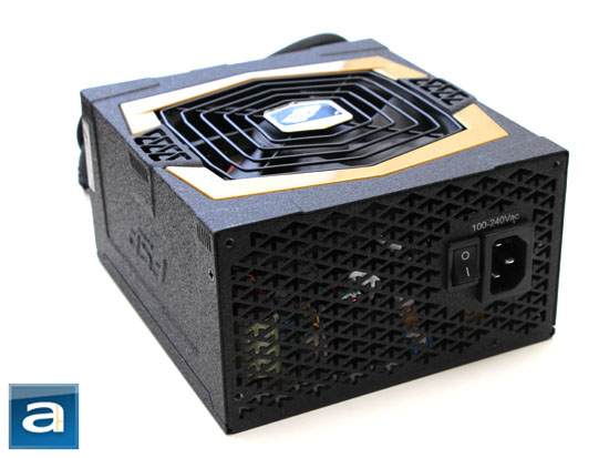 Starting from the back part of the power supply, the rear mesh design is similar to most PSUs with bottom mounted fans; except this one comes with a unique design pattern consistent with the rest of the AURUM CM Gold and AURUM Gold PSUs. The standard on/off switch located on the right side of the male connector for power input near the left side of the unit. Its low resistance arrowhead mesh design is implemented to maximize heat exhaust and minimize air resistance. This is done as heat needs to leave the power supply as easily and efficiently as possible, because the FSP AURUM CM Gold 650W incorporates only one 120mm fan at the bottom, with no auxiliary fans. It is also implemented in an efficient manner, as these components take up minimal amounts of room at the back. As with most new power supplies, the AURUM CM Gold has an automatic full range (100V-240V) AC line voltage selection, so the user does not have to worry about manually selecting input voltage.