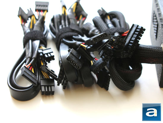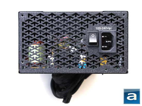 The rear cable connection panel is done quite nicely. The Molex and SATA cables share the same output sockets, while the PCI Express cable is on adjacent to this array on the left. The PCI Express and Molex/SATA sockets are physically incompatible with each other, so there is absolutely no worry about plugging in the wrong thing. This array of available connectors in conjunction with the provided cables should be more than sufficient for casual users and power enthusiasts alike.