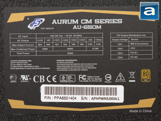 The voltage specification label at the top of the FSP AURUM CM Gold 650W. There are two main virtual rails. Up to 26A can be delivered via the +3.3V rail for a total of 85.8W; while 26A on the +5V rail brings the output to 130W in this area. The total combined output for the +3.3V and +5V rail is 150W. In other words, your power allocation combination must fall within the limits of the listed specifications. Meanwhile, four virtual +12V rails deliver up to 18A (216W) per rail, with a combined maximum of up to 600W across all four. Normally, we would prefer a large single +12V rail due to lower operation overhead. Overall, the combined power output is... well, 650W haha. Again, your power distribution in your system must fall within the limits provided -- it must not exceed 85.8W on the +3.3V rail, 130W on the +5V rail and 150W combined for both, 216W per +12V rail for a maximum of 600W for all four combined, and 650W combined between the +12V and +3.3/+5V rails. It does sound a bit confusing to understand how this works at first, but generally speaking this configuration allows reasonably flexible power demands and should be sufficient to accommodate most users and about what you would expect from a 650W power supply unit.