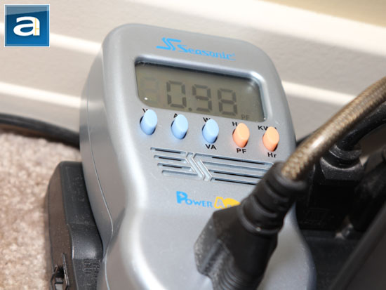 Active power correction is important to correct AC load line loss. In AC power, there are three components to it; as there is a phase difference between current and voltage. This makes up the power triangle, which consists of the following: Average usable power (P, measured in watts), reactive power (Q, denoted as VA-R), and total power (S, written as VA). While they all have the same physical units, it is not the same thing as aforementioned. What we want is the average usable power -- with as little wasted reactive power as possible. The total power provided over the AC line is the magnitude of the two combined (sqrt(P^2+Q^2)). Power factor can then be easily calculated by P/S. The ideal value is 1.00, and this is where active PFC comes in. A nominal load of 200W (~30%) on the FSP AURUM CM Gold 600W had the power factor between 0.98 and 0.99. As the load increases, the PF should remain at 0.99.