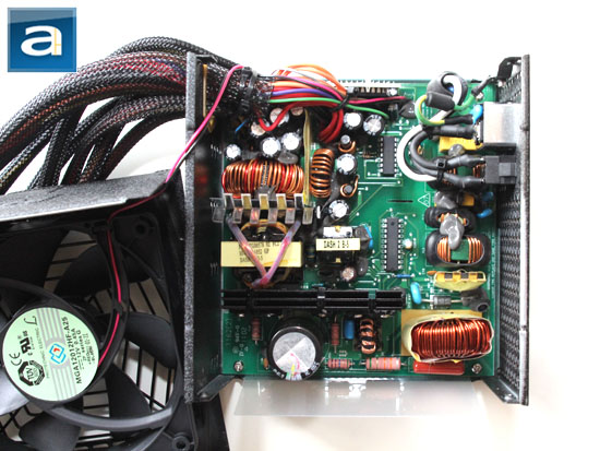 The DC-to-DC converter is controlled by one proprietary FSP6601 integrated circuit chip and four Infineon OptiMOS 3 Power-Transistors for its +3.3V and +5V outputs. Meanwhile, a Weltrend WT7579 monitoring IC provides the AURUM Gold's OVP, UVP, OCP, SCP, and OPP. Unfortunately, I can't seem to find any information on this IC; I've dug through every section of Weltrend's website without any luck.
