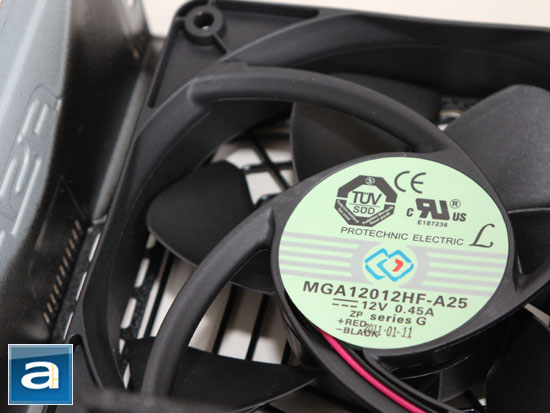 Lastly, we see a 120mm fan that provides cooling to the FSP AURUM Gold 600W's internal components. It is connected to the mainboard using a 2-pin connector. A 120mm fan is standard size for standard ATX power supplies with a bottom fan mount, and it is beneficial in most cases in providing lots of airflow at lower speeds for quiet operation. Protechnic is the fan OEM; further research indicates the MGA12012HF-A25 is a 120x120x25mm "Series G" fluid dynamic bearing fan specified at 0.45A for a maximum of speed of 2400 rpm. The rated airflow is 84.8 CFM at 37 dB of noise.