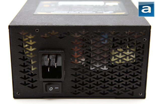 Starting from the back part of the power supply, the rear mesh design is similar to most PSUs with bottom mounted fans; except this one comes with a unique pattern originally found on the AURUM Gold and AURUM CM Gold PSUs. The on/off switch located below the male connector for power input near the left side of the unit. Notice that the male connector is a C20 plug -- I really don't see normal consumers having an extra cable kicking around too frequently. I can see why, as the included AC power cable is a fat 14 AWG unit to ensure you won't be using some cheap generic $1 replacement, but I don't think this is necessary at all. If you end up losing the cable, you will be out of luck.
