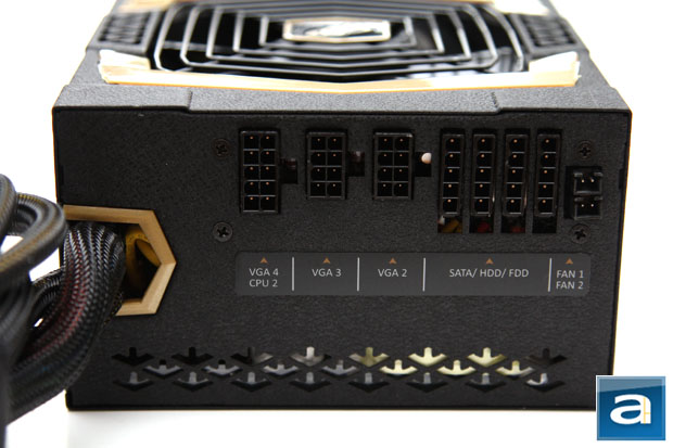 The rear cable connection panel is done quite nicely. This time around, it is labeled really well, too. The Molex and SATA cables share the same output sockets, while the PCI Express cables are adjacent to this array on the left. The PCI Express and Molex/SATA sockets are physically incompatible with each other, so there is absolutely no worry about plugging in the wrong thing. On the very right are two headers for a specialized low voltage fan-only output. This array of available connectors in conjunction with the provided cables should be more than sufficient for casual users and power enthusiasts alike.