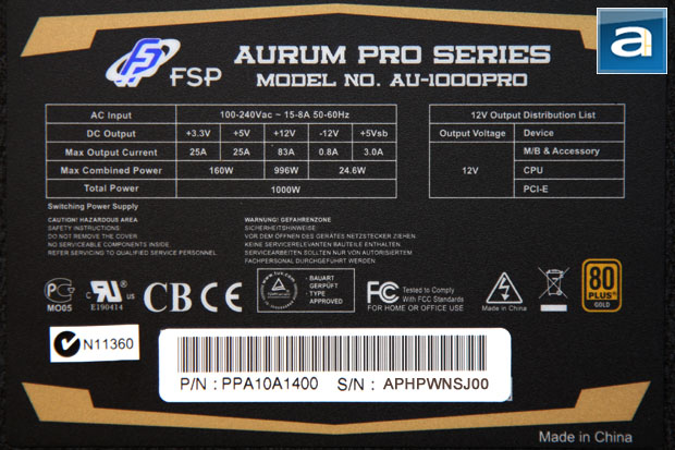 The voltage specification label at the top of the FSP AURUM Pro 1000W. There are two main virtual rails. Up to 25A can be delivered via the +3.3V rail for a total of 82.5W; while 25A on the +5V rail brings the output to 125W in this area. The total combined output for the +3.3V and +5V rail is 160W. In other words, your power allocation combination must fall within the limits of the listed specifications. Meanwhile, a single powerful +12V rail delivers up to 83A (996W) to reduce operating overhead compared to multiple +12V rails. Overall, the combined power output for the whole AURUM Pro is... well, 1000W haha. Again, your power distribution in your system must fall within the limits provided -- it must not exceed 82.5W on the +3.3V rail, 125W on the +5V rail and 160W combined for both, 996W on the +12V rail, and 1000W combined between the +12V and +3.3/+5V rails. It does sound a bit confusing to understand how this works at first, but generally speaking this configuration allows very flexible power demands and should be sufficient to accommodate most users. On the other hand, I have seen lower wattage PSUs with more power on the +5V rail, so I would actually expect a little more in this area for a 1000W power supply unit.