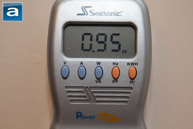 Active power correction is important to correct AC load line loss. In AC power, there are three components to it; as there is a phase difference between current and voltage. This makes up the power triangle, which consists of the following: Average usable power (P, measured in watts), reactive power (Q, denoted as VA-R), and total power (S, written as VA). While they all have the same physical units, it is not the same thing as aforementioned. What we want is the average usable power -- with as little wasted reactive power as possible. The total power provided over the AC line is the magnitude of the two combined (sqrt(P^2+Q^2)). Power factor can then be easily calculated by P/S. The ideal value is 1.00, and this is where active PFC comes in. A nominal load of 82W (8.2%) on the FSP AURUM Pro 1000W had the power factor at 0.95. This figure is pretty impressive, considering active PFC usually does not work very well with such a small load. As the load increases, the PF should approach 0.99.