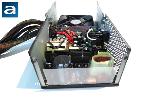 When it comes to size, the design of the power supply allows for a very spacious interior environment. FSP always takes a minimalist approach, and this has been a very good thing for them. By minimizing the number of components inside, they also raise the amount of free room inside, which in turn helps the airflow and thermal design of the overall product. As the FSP AURUM S 600W is not a modular power supply, there is no daughterboard at the back; all output cables are just bundled together and soldered on. In most cases, one large, or even several large heatsinks, are used to dissipate heat in a power supply. However, our unit only has a single small black heatsink used to dissipate heat generated by the components. I am surprised such a small heatsink is required. Considering this power supply is an 80 Plus Gold certified unit, it makes sense -- just looking at it makes you consider how efficient this product is. Its cooling system is designed to work with a 120mm fan.