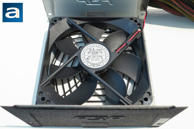 A Yate Loon Electronics fan is used to cool the PSU, as you can see in our photo above. Specifically, it is the Yate Loon D12SM-12, which has a maximum speed of 1800RPM, airflow of 62 CFM at 12V, and a noise level of 28.5 dB. The fan here is pretty much standard fare, and considering that the noise level is rated lower from FSP, we can deduce that the fan has been capped at a reduced maximum speed than the specified 1800RPM.