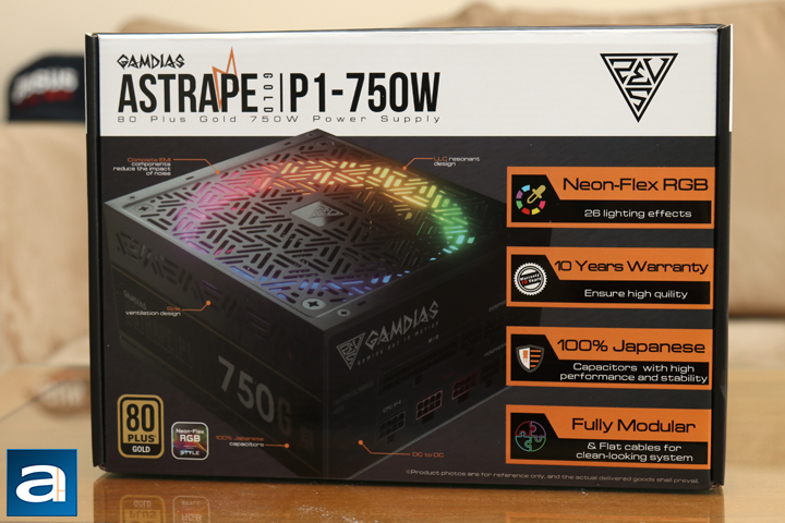 The retail packaging of the ASTRAPE P1-750G 750W falls in line with previous GAMDIAS products with a predominantly black box, followed by some white panels and orange accents. The power supply itself is situated on the front panel in plain sight. The product's name and description is printed at the top. Several main selling points about this power supply are listed on the right side, including RGB lighting effects, ten year warranty, 100% Japanese capacitors, and a fully modular unit. On the side there are more features and specifications of the power supply. Otherwise, there is not much else to look at besides a noticeable typo on the box.