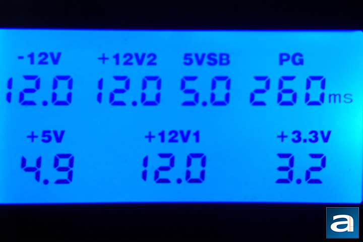 Voltages with minimal load are generally accurate, which is a basic requirement of power supplies out of the box. In this situation all are within 3%. The PG (Power Good) delay seems to be well within its rated range and general power supply standard at 260ms.