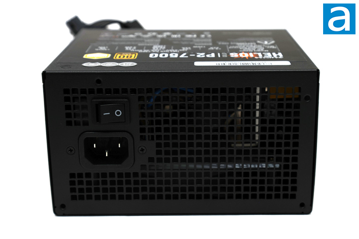 At the back, we have a square grid pattern to allow airflow through. This ventilation area plays a crucial role in allowing heat to flow out the back. Most modern power supplies have an automatic full range -- 110V to 240V -- AC line voltage selection, so there is no need for a manual switch as seen on some older units. Therefore, the back only has a power switch and a standard power input. There is no silent mode with the GAMDIAS HELIOS P2-750G 750W.