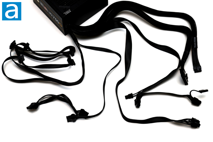 As aforementioned, the GAMDIAS HELIOS P2-750G 750W is a non-modular power supply, and all seven cables are permanently attached to the unit. Two of these cables are wrapped in a mesh sleeve, while the other three are flat cables. All of the cable wires are 18AWG, with the exception of the 12VHPWR cable, which is 16AWG. The seven included cables are as is: