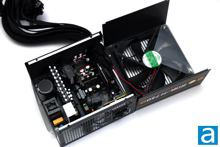 Opening the GAMDIAS HELIOS P2-750G 750W is quite straightforward with the removal of four screws. Taking out the internal components from the enclosure requires the removal of even more screws, but most of the important parts can be found from this side. The OEM for this power supply is High Power, formerly known as Sirfa or Sirtec. It features an LLC half-bridge topology with DC-to-DC converters. This is in contrary to what their website claims at press time of being a full-bridge design. At first glance, the build quality appears to be average. There are four heatsinks inside, located on both the primary and secondary side. The two heatsinks on the secondary side do not seem to have any components directly attached to it on the top, but there are components underneath that use this.