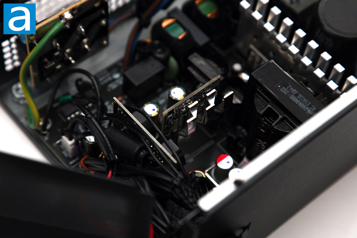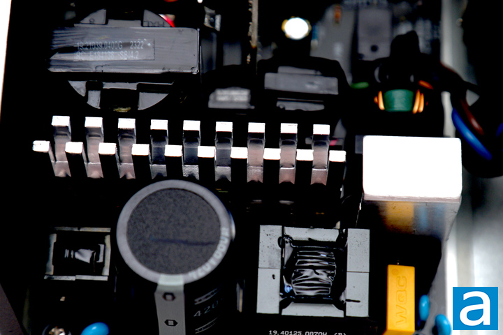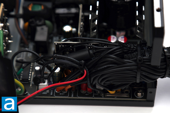 Finally, you can see where all the cables are connected and sleeved to lead outside of the GAMDIAS HELIOS P2-750G 750W. There is nothing too special here, other than the fact there are a lot of cables running around. The overall build quality is average for a budget power supply with some corners cut to keep the costs down. Component selection is on the lower tier of parts generally. Some parts are pretty close together, but the large heatsinks and relatively open layout should help with heat dissipation.