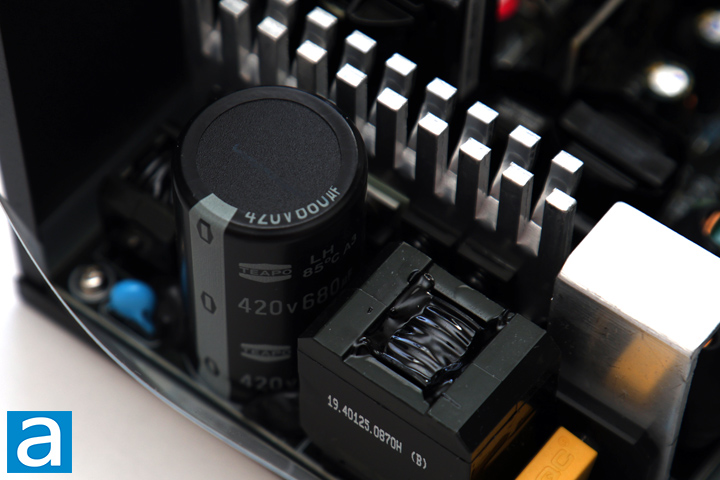 The primary capacitor is a single Taiwanese Teapo LH 680µF x 420V. This is rated at 85c, which is rather unfortunate. Most power supplies we see nowadays use 105c, which indicates better durability and quality of the capacitors. Finally, we have two switcher MOSFETs located on the same heatsink near the active PFC MOSFETs. These are the same Infineon IPA60R120P7 we have mentioned previously. Clearly, this is a half-bridge topology and not the full bridge topology as GAMDIAS claims on their website.