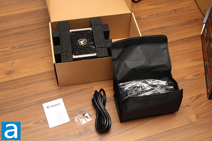 The Gigabyte AORUS P850W 850W's retail packaging can be opened by a flap attached at the bottom after sliding out the brown corrugated cardboard box. Upon opening the box, you will find everything neatly organized. The power supply is securely clipped in by two foam brackets on the left with cables and everything else in a nylon bag on the right. Out of the box, you will receive the AORUS P850W power supply itself, modular cables, AC power cable, four screws, and a product manual. The bundle is very minimalist; you will not even find a Velcro strap or zip tie.