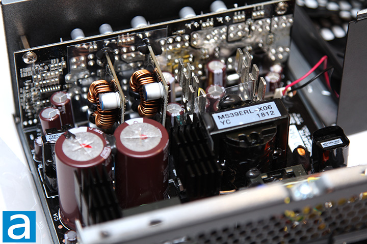 On the secondary side, we can see more Japanese brand capacitors from Chemi-Con rated at 105c. As with modern high efficiency power supplies, all rectifiers produce the +12V out -- while the +5V and +3.3V outputs are generated from the +12V output using a DC to DC converter within the power supply unit. Four Alpha & Omega AOT2142L MOSFETs are responsible for generating the +12V output. The AOT2142L's rated continuous drain current is 120A at 100c, and a pulsed drain current of 600A. It has a RDS(on) value of 0.0019 ohm maximum and 0.00155 ohm typical. Eight Alpha & Omega AON6360 MOSFETs are responsible for generating the +5V and +3.3V outputs. The AON6360's rated continuous drain current is 59A at 100c and a pulsed drain current of 180A. Drain source voltage is rated at 30V, and a RDS(on) value of 0.003 ohm maximum and 0.0025 ohm typical. Meanwhile, a Weltrend WT7527 monitoring IC provides over/under current and over/under voltage protection. The datasheets for all components mentioned in this review can be found on their respective manufacturer's websites.