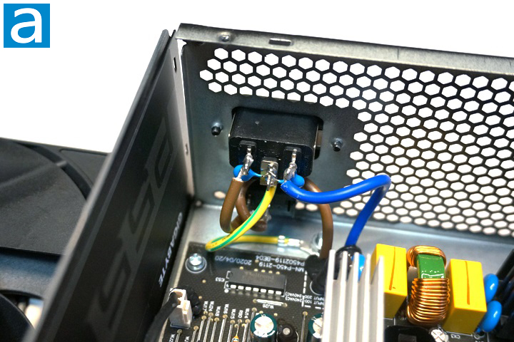 The Gigabyte P550B 550W is not a modular PSU. Therefore, there is no daughterboard at the rear of the power supply unit to hold the sockets. Instead, all the cables are connected directly to the main PCB. Having good connection quality of those cables is very important. If a cable is ripped off, the user will not be able to reconnect it back without opening the case and using soldering iron. The overall internal design of Gigabyte P550B 550W PSU is very good. Yes, it is budget PSU with low-cost components, but they are placed in a well-organized manner. According to the above photo, you can tell the Gigabyte P550B 550W features good assembly quality and there are no random fly wires.