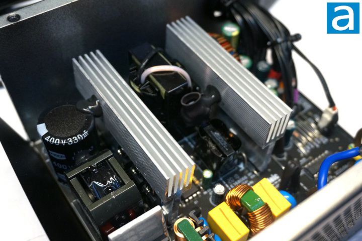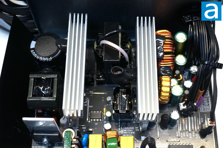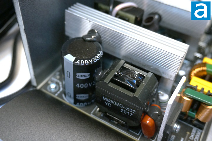 In the above photo, we can see there is a smaller heatsink to the left side of the long heatsink panel on the primary side. There is a rectifying bridge attached to that heatsink. This time, I am not able to find any information about this rectifying bridge. This is because there is nothing printed on the rectifying bridge chip, and I cannot find any useful information online neither. The thing I like about it is, the rectifying bridge has its own heatsink, which can guarantee the cooling performance. For the APFC MOSFETs, there is another set of JCS18N50F chips on the primary side long heatsink. There is also a STMicroelectronics STTH8S06D as the APFC boost diode.