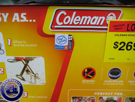 Today I was walking around London Drugs, a local store similar to a mini Wal-Mart. I was looking at the front display of a Coleman BBQ grill. Not only did I notice the huge price tag advertising an overpriced Coleman grill but also something very familiar to users at APH. We have been known to call it the PresHott but in reality it is a Intel Pentium Prescott. I am fairly surprised that it would be put used in a barbeque.